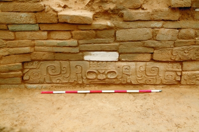 皇城臺為一處四圍包砌石砌護墻的高阜臺地,位于內(nèi)城中部偏西?;食桥_臺頂?shù)囊恍┐笮徒ㄖ湓谝惶幋笮团_基上。2018年,從這處大臺基南護墻倒塌的墻體石塊內(nèi),考古隊出土了30余件石雕作品,有一些石雕還鑲嵌在南護墻墻面上。這些石雕絕大多數(shù)是雕刻于石塊一面的單面雕刻,有符號、人面、神面、動物、神獸等,有一些畫面長度近3米,以中心正臉的神面為中心,兩側(cè)對稱雕出動物和側(cè)臉人面,體現(xiàn)出成熟的藝術(shù)構(gòu)思和精湛的雕刻技藝。
