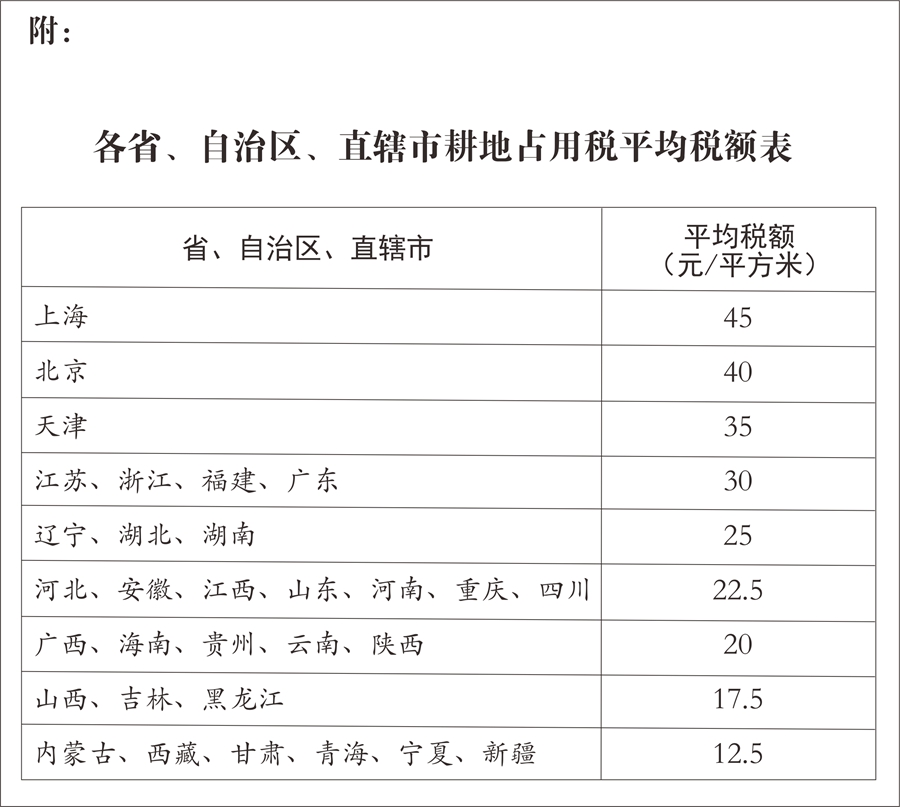 各地區(qū)耕地占用稅的適用稅額,由省、自治區(qū)、直轄市人民政府根據(jù)人均耕地面積和經(jīng)濟發(fā)展等情況,在前款規(guī)定的稅額幅度內(nèi)提出,報同級人民代表大會常務(wù)委員會決定,并報全國人民代表大會常務(wù)委員會和國務(wù)院備案。各省、自治區(qū)、直轄市耕地占用稅適用稅額的平均水平,不得低于本法所附《各省、自治區(qū)、直轄市耕地占用稅平均稅額表》規(guī)定的平均稅額。