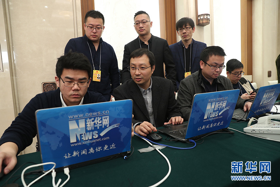 全國政協(xié)十三屆一次會議新聞發(fā)布會3月2日16:30在人民大會堂一層新聞發(fā)布廳召開,大會新聞發(fā)言人王國慶向中外媒體介紹本次大會有關(guān)情況并回答記者提問。圖為發(fā)布會前新華網(wǎng)直播團隊進行準(zhǔn)備工作。新華網(wǎng)/中國政府網(wǎng) 翟子赫攝