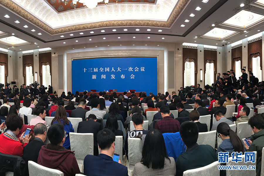 3月4日,十三屆全國人大一次會議在人民大會堂新聞發(fā)布廳舉行新聞發(fā)布會,由大會發(fā)言人張業(yè)遂就大會議程和人大工作相關的問題回答中外記者的提問。圖為新聞發(fā)布會現(xiàn)場。新華網(wǎng)/中國政府網(wǎng) 陳杰 攝