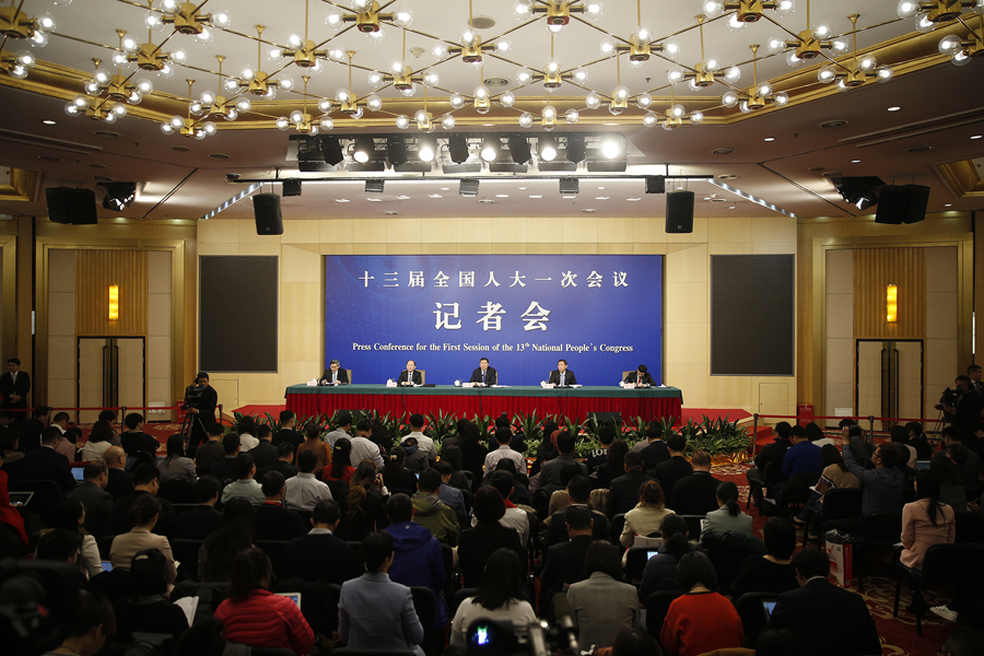 十三屆全國人大一次會議新聞中心3月6日上午10時(shí)在梅地亞中心多功能廳舉行記者會,邀請國家發(fā)展和改革委員會主任何立峰、副主任張勇、副主任寧吉喆就“創(chuàng)新和完善宏觀調(diào)控,推動高質(zhì)量發(fā)展”相關(guān)問題回答中外記者提問。圖為記者會現(xiàn)場。 新華網(wǎng)/中國政府網(wǎng) 陳杰 攝