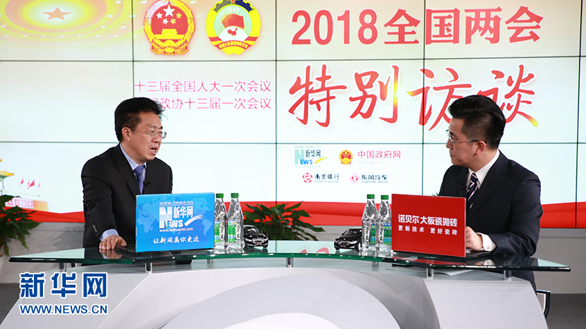 全國人大代表、中國人民銀行鄭州中心支行行長徐諾金(左)做客新華網(wǎng)2018全國兩會特別訪談。新華網(wǎng)楊锘攝