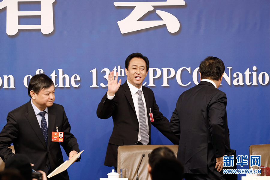 3月10日8時45分,全國政協(xié)十三屆一次會議在梅地亞中心多功能廳舉行記者會,邀請5位全國政協(xié)委員就“提高保障和改善民生水平”回答記者提問。圖為記者會結(jié)束后,許家印與記者們揮手告別。新華網(wǎng)/中國政府網(wǎng) 翟子赫 攝