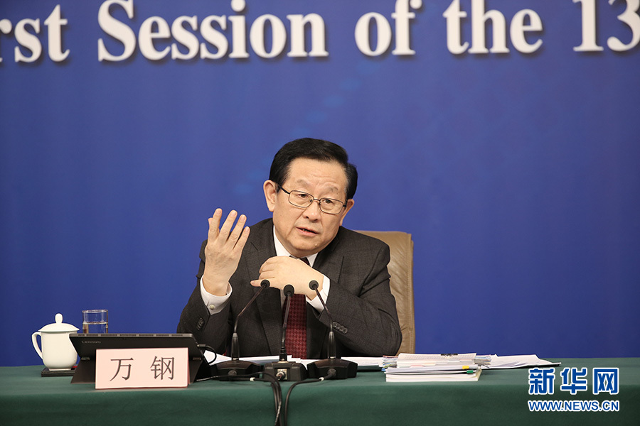 十三屆全國人大一次會議新聞中心于10日上午10時(shí)45分在梅地亞中心多功能廳舉行記者會,邀請科技部部長萬鋼、政策法規(guī)與監(jiān)督司司長賀德方、創(chuàng)新發(fā)展司司長許倞就“加快建設(shè)創(chuàng)新型國家”相關(guān)問題回答中外記者提問。圖為萬鋼回答記者提問。新華網(wǎng)/中國政府網(wǎng) 翟子赫 攝