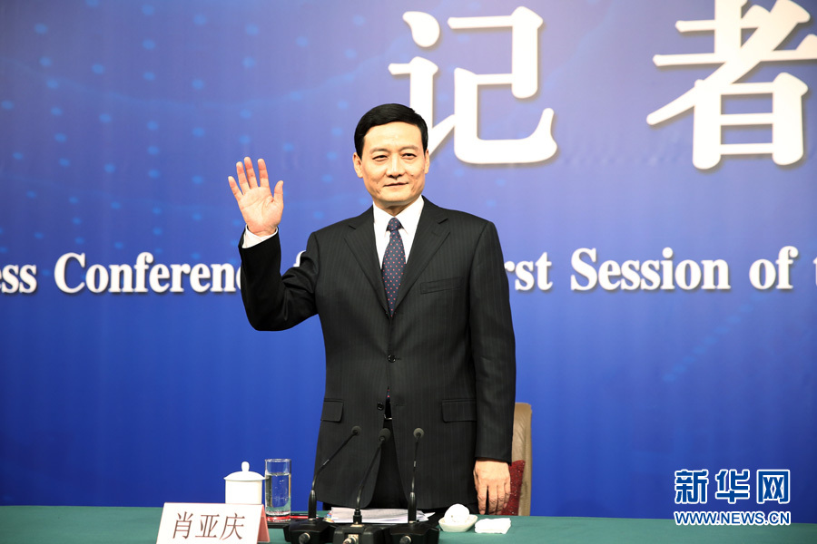 十三屆全國人大一次會議新聞中心3月10日15時在梅地亞中心多功能廳舉行記者會,邀請國務院國資委主任肖亞慶,副秘書長、新聞發(fā)言人彭華崗就“國有企業(yè)改革發(fā)展”相關問題回答中外記者提問。圖為肖亞慶向記者示意。新華網/中國政府網 翟子赫 攝