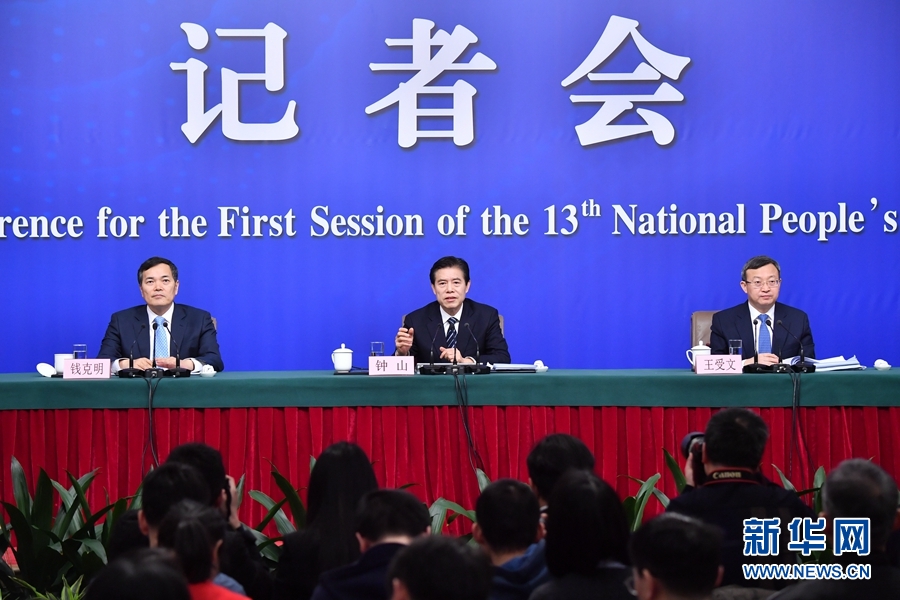 3月11日,十三屆全國人大一次會議新聞中心舉行記者會,邀請商務部部長鐘山、副部長兼國際貿(mào)易談判副代表王受文、副部長錢克明就“推動形成全面開放新格局推動商務事業(yè)高質(zhì)量發(fā)展”相關問題回答中外記者提問。 新華社記者 李鑫 攝