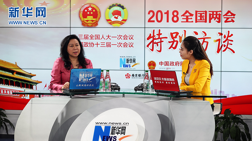 圖為全國(guó)政協(xié)委員、新大陸科技集團(tuán)總裁王晶做客新華網(wǎng)2018全國(guó)兩會(huì)特別訪談。新華網(wǎng) 郭小天攝