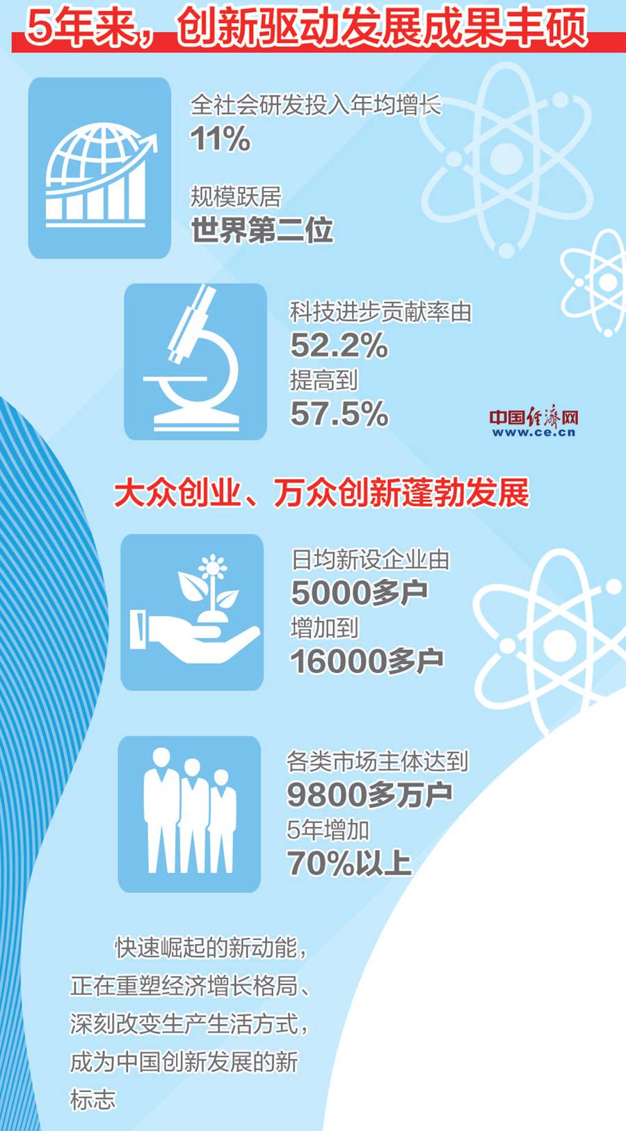 這5年,創(chuàng)新驅(qū)動(dòng)發(fā)展成果豐碩。全社會(huì)研發(fā)投入年均增長(zhǎng)11%,規(guī)模躍居世界第二位;科技進(jìn)步貢獻(xiàn)率提高了5.3個(gè)百分點(diǎn);載人航天、深海探測(cè)、量子通信、大飛機(jī)等重大創(chuàng)新成果不斷涌現(xiàn);高鐵網(wǎng)絡(luò)、電子商務(wù)、移動(dòng)支付、共享經(jīng)濟(jì)等引領(lǐng)世界潮流……這一切,都源于我們實(shí)施的創(chuàng)新驅(qū)動(dòng)發(fā)展戰(zhàn)略。在今年兩會(huì)上,代表委員圍繞“創(chuàng)新”這個(gè)關(guān)鍵詞,有講不完的話題。