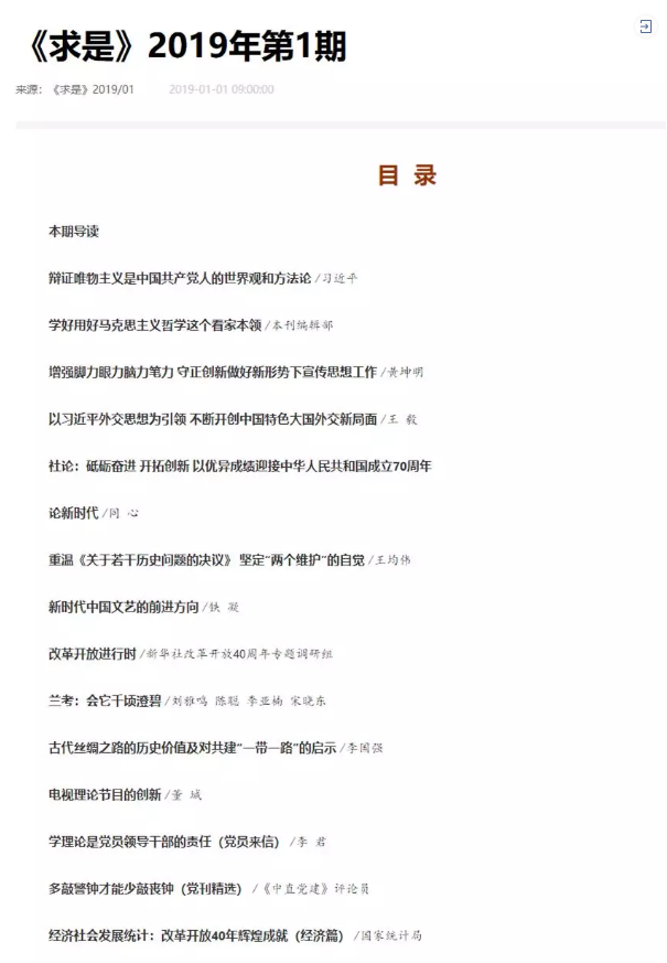 剛剛出版的2019年第1期首發(fā)了習(xí)近平總書記重要文章《辯證唯物主義是中國共產(chǎn)黨人的世界觀和方法論》,配發(fā)了學(xué)習(xí)習(xí)近平總書記重要文章的編輯部文章《學(xué)好用好馬克思主義哲學(xué)這個看家本領(lǐng)》。