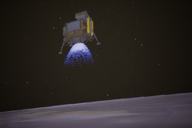 圖為1月3日在北京航天飛行控制中心拍攝的降落過程(示意圖)。1月3日10時(shí)26分,嫦娥四號探測器自主著陸在月球背面南極-艾特肯盆地內(nèi)的馮·卡門撞擊坑內(nèi),實(shí)現(xiàn)人類探測器首次在月球背面軟著陸。新華社記者 金立旺 攝