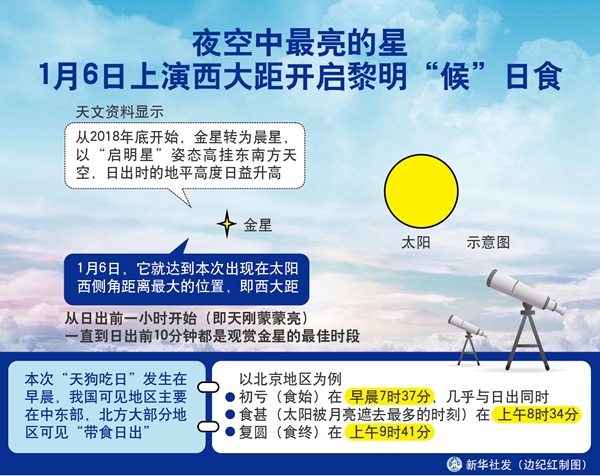 新華社天津1月4日電(記者周潤健)對(duì)于天文愛好者來說,本月6日注定會(huì)是一個(gè)忙碌的早晨,看完西大距的金星,就可以繼續(xù)欣賞一次精彩的日偏食。