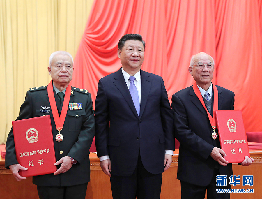 1月8日,2018年度國家科學(xué)技術(shù)獎(jiǎng)勵(lì)大會(huì)在北京人民大會(huì)堂隆重舉行。這是中共中央總書記、國家主席、中央軍委主席習(xí)近平向獲得2018年度國家最高科學(xué)技術(shù)獎(jiǎng)的哈爾濱工業(yè)大學(xué)劉永坦院士頒發(fā)獎(jiǎng)?wù)隆?新華社記者 謝環(huán)馳 攝