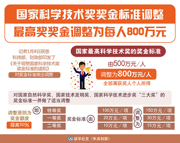 圖表:國家科學(xué)技術(shù)獎獎金標(biāo)準(zhǔn)調(diào)整 最高獎獎金調(diào)整為每人800萬元 新華社發(fā) 朱禹 制圖