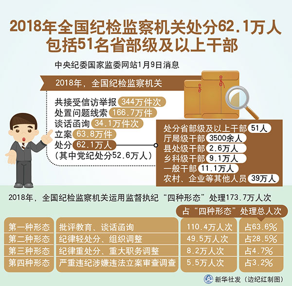 圖表:2018年全國紀(jì)檢監(jiān)察機(jī)關(guān)處分62.1萬人 包括51名省部級及以上干部 新華社發(fā) 邊紀(jì)紅 制圖