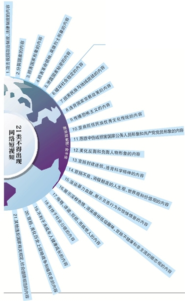 《規(guī)范》和《細則》針對網(wǎng)絡(luò)視聽領(lǐng)域存在的不足和薄弱環(huán)節(jié),分別對開展短視頻服務(wù)的網(wǎng)絡(luò)平臺以及網(wǎng)絡(luò)短視頻內(nèi)容審核的標(biāo)準(zhǔn)進行規(guī)范?!都殑t》明確了21類、100項內(nèi)容,“喪文化”“一夜情”“非主流婚戀觀”等都不得出現(xiàn)在短視頻中。