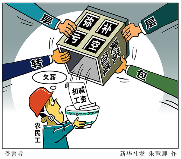 濟(jì)南市農(nóng)民工綜合服務(wù)中心主任丁麟宏說(shuō),一些施工單位為取得承包權(quán),惡意競(jìng)爭(zhēng)壓低價(jià)格,再將工程和勞務(wù)關(guān)系層層發(fā)包,延長(zhǎng)了風(fēng)險(xiǎn)鏈條,而一旦工程款等前端環(huán)節(jié)出現(xiàn)合同損失,施工方便以扣減工資方式彌補(bǔ)虧空,最終使農(nóng)民工成為受害者。