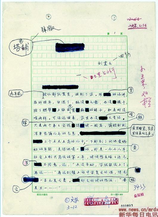 此次展出的手稿,還有手寫(xiě)于農(nóng)民日?qǐng)?bào)社稿紙的劉震云小說(shuō)《塔鋪》。與莫言《透明的紅蘿卜》類(lèi)似的,這篇“新寫(xiě)實(shí)小說(shuō)”代表作的篇名也是修改過(guò)的,原名叫“河堤”,后來(lái)才改為“塔鋪”。盡管是謄清的手稿,其中仍充滿大量細(xì)微的刪減與成塊的涂抹。“不小心”改為“無(wú)意間”,“聚在”改為“聚到”,連“地”“的”“還”“又”等字眼也在斟酌后刪去,體現(xiàn)了作者對(duì)凝練精準(zhǔn)、不冗不贅的語(yǔ)言風(fēng)格的極致追求。