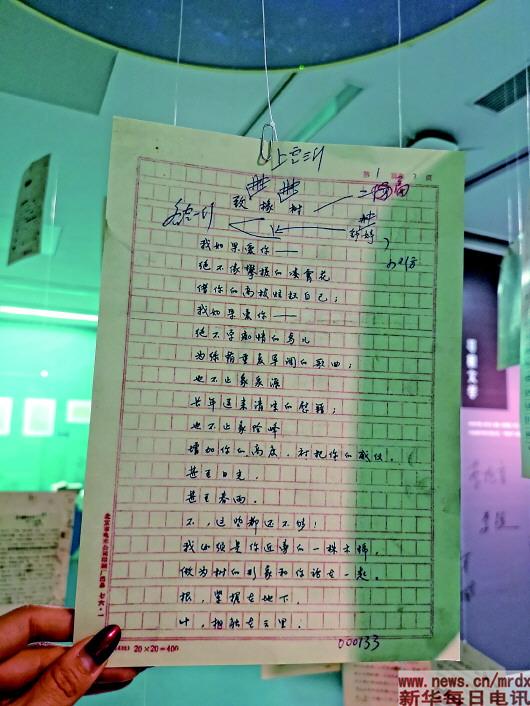 舒婷的詩(shī)歌代表作《致橡樹(shù)》就寫(xiě)在42年前的兩頁(yè)“北京市電車(chē)公司印刷廠”印制的紅色格子稿紙上。如今它被串上線,懸掛在中國(guó)現(xiàn)代文學(xué)館的展廳中央。