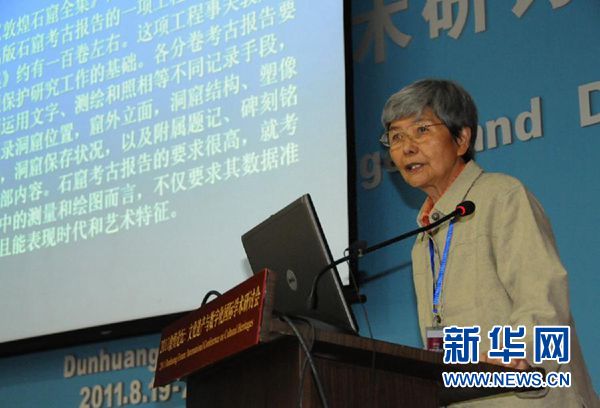 2011年8月19日,在敦煌莫高窟舉行的文化遺產(chǎn)與數(shù)字化國(guó)際學(xué)術(shù)研討會(huì)上,敦煌研究院院長(zhǎng)樊錦詩(shī)在作報(bào)告。? 新華社發(fā)