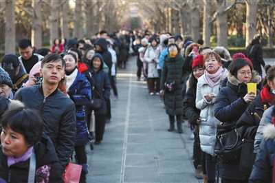 1月13日,雍和宮內(nèi)百米甬道,市民排隊等待領(lǐng)取臘八粥。
