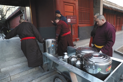 雍和宮內(nèi)僧人們搬運連夜熬制的臘八粥。