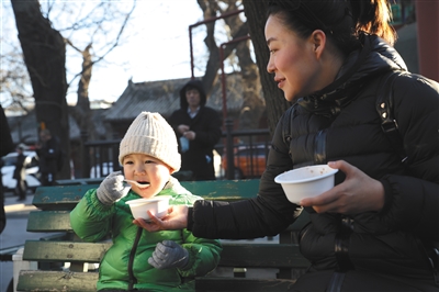 代女士已經(jīng)連續(xù)13年來雍和宮喝臘八粥了。她說,自己懷孕時偶然趕上雍和宮舍粥,因為自己是高齡產(chǎn)婦,許愿“母子平安”。隨后每年臘八她都帶上家人來喝上一碗粥,今年恰逢周末,她就帶上兒子一起來,“參與這個節(jié)日已經(jīng)成了我們家的傳統(tǒng),每年來這里祈福納祥?!保ㄓ浾?張彤 攝影/記者 王飛)