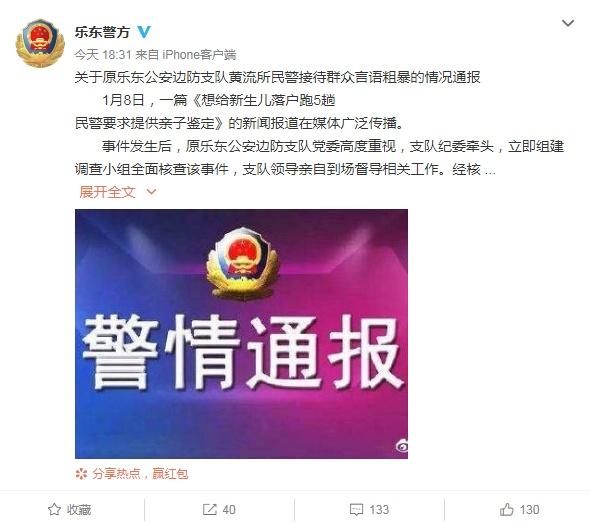 近日,有媒體報道海南樂東黎族自治縣居民邢先生為了給新生兒落戶,跑了5趟派出所,甚至被民警索要親子鑒定的“折騰”經(jīng)歷,引發(fā)關注。1月13日,海南樂東黎族自治縣公安局發(fā)布通報稱,涉事民警未能及時核實戶籍辦理材料,導致戶籍辦理時間較長,且在接待群眾時出現(xiàn)言語不當、行為粗暴的情況。因此,對涉事民警給予通報批評處理,并調(diào)離原工作崗位。