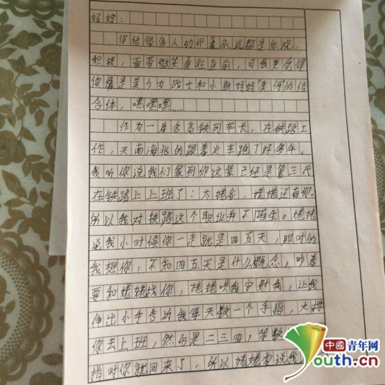 小嘉琪寫(xiě)給列車(chē)長(zhǎng)媽媽的信。中國(guó)青年網(wǎng)記者 尹海超 攝