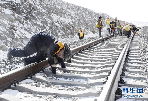 青藏鐵路格爾木工務(wù)段望昆線路養(yǎng)護車間副主任于本蕃(前)跪在鐵路上對已完成檢修的鐵軌進行復(fù)檢(1月11日攝)。 新華社發(fā)(王浡 攝)