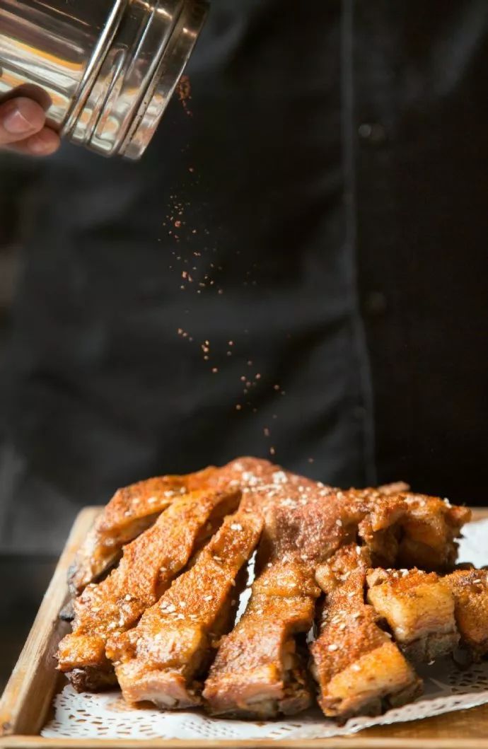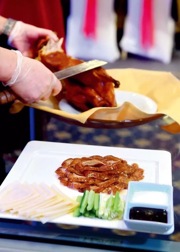 剛烤完的鴨子,一刀刀片好,皮肉分離。鴨皮蘸糖,放入口中,無(wú)須咀嚼,鴨皮入口即化,酥香悠長(zhǎng)的回味在齒間彌漫。