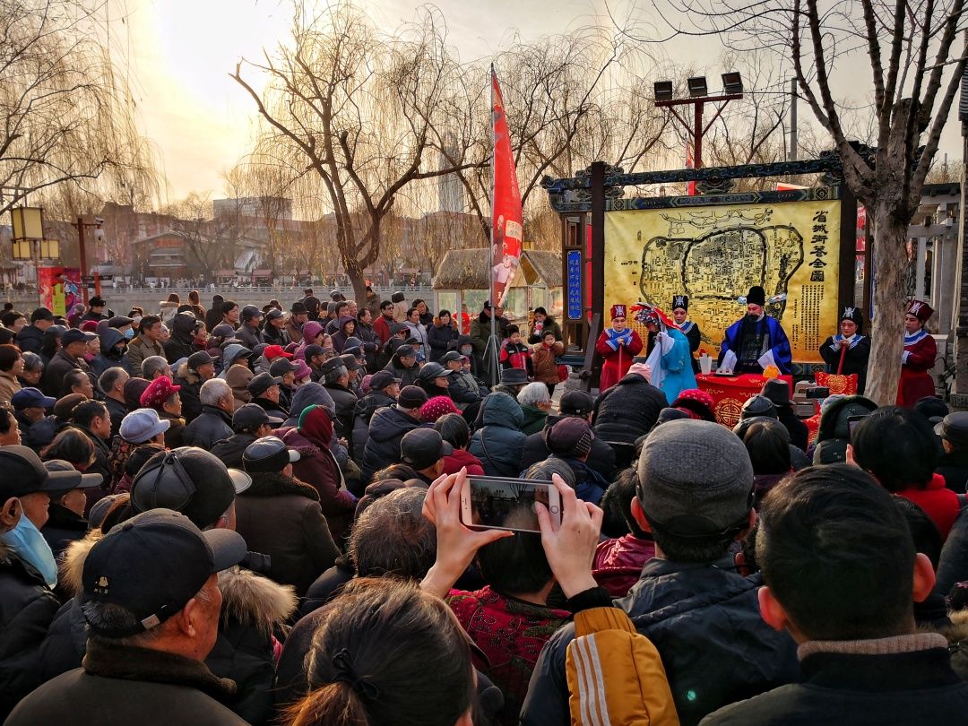 2019-01-05,山東省濟(jì)南市百花洲。臨近春節(jié),在濟(jì)南百花洲畔,非遺地方戲曲展演正在上演,吸引過往游人層層圍觀、駐足叫好。作者:地伐