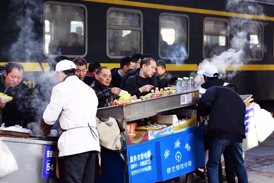 2019-01-22,陜西省安康市。呼和浩特至昆明K691次列車到達(dá)安康站,旅客被站臺售賣的美食所吸引。作者:玩家