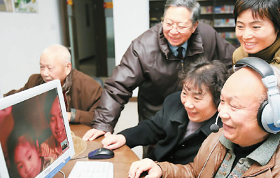 家住杭州的張淼林夫婦通過(guò)網(wǎng)絡(luò)視頻和美國(guó)的兒子一家通話,6歲的孫女在網(wǎng)上給爺爺奶奶拜年。資料圖片