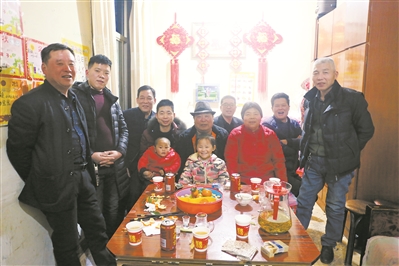 遠(yuǎn)處鞭炮聲聲,董星濤(左四)和家人們圍坐桌前準(zhǔn)備吃年夜飯。聞蘇軼攝