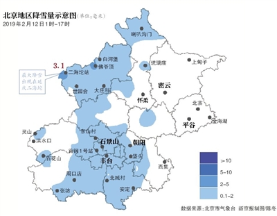 監(jiān)測顯示,12日01時至16時,北京全市平均降雪量0.5毫米,城區(qū)平均0.6毫米,最大降雪出現(xiàn)在延慶二海坨3.1毫米。