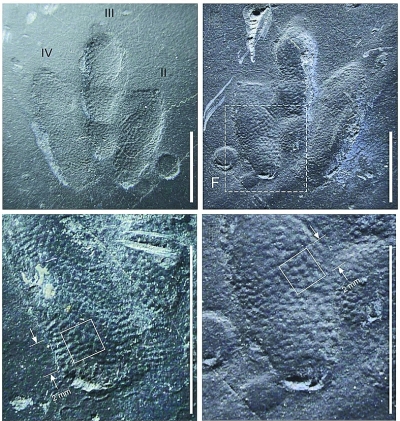 這些精致的小龍足跡一共有4個,組成了一道行跡,仿佛跨越了1億年的時空遇到人類?!靶↓堊阚E僅在韓國和中國發(fā)現(xiàn),是東亞白堊紀(jì)的特有足跡。這是世界上第10處發(fā)現(xiàn)有小龍足跡的化石點,也是首次發(fā)現(xiàn)這種足跡的皮膚印痕?!绷昼姁湼嬖V記者。此前,古生物學(xué)家從未發(fā)現(xiàn)過有如此完美的皮膚印痕,足跡上的鱗片痕跡平均直徑還不到0.4毫米,而且不同于此前的鱗片印痕僅出現(xiàn)在足跡的部分區(qū)域,小龍足跡保存了整個腳底的皮膚。