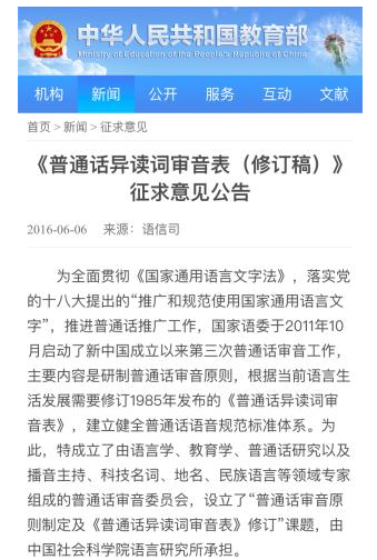 1985年,國家發(fā)布《普通話異讀詞審音表》,對一些異讀詞進行了修訂。2016發(fā)布的《<普通話異讀詞審音表(修訂稿)>征求意見稿》又對一些讀音進行了新的修訂,并發(fā)布在教育部網站上征求意見。
