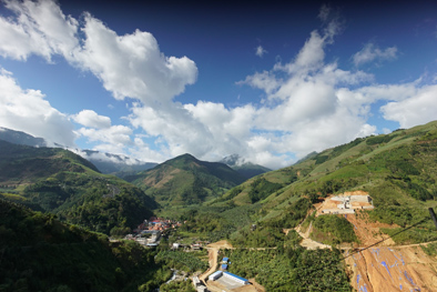▲“莽人”村寨(左側(cè)山麓上的小村莊)和山下的多民族聚居的南科村。岳廷攝