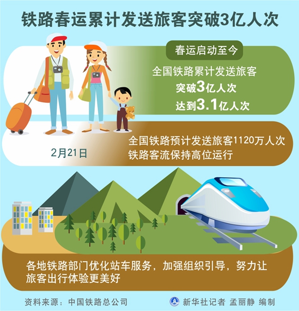 新華社北京2月21日電(記者樊曦)記者從中國(guó)鐵路總公司獲悉,春運(yùn)啟動(dòng)至今,全國(guó)鐵路累計(jì)發(fā)送旅客突破3億人次,達(dá)到3.1億人次。
