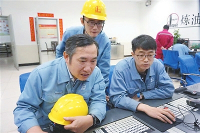 新招聘的高職生跟著中國石化技能大師孫同根學(xué)習(xí)操作技巧。陳康 攝