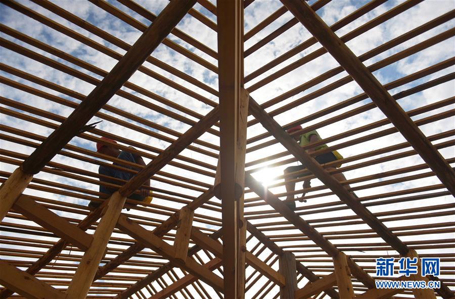 在湖北省宣恩縣曉關侗族鄉(xiāng),工人在建設吊腳樓(2018年7月26日攝)。2018年,當?shù)卣_始修建6座新的侗寨吊腳樓,為符合易地搬遷政策的貧困戶實施搬遷。新華社發(fā)(王俊 攝)