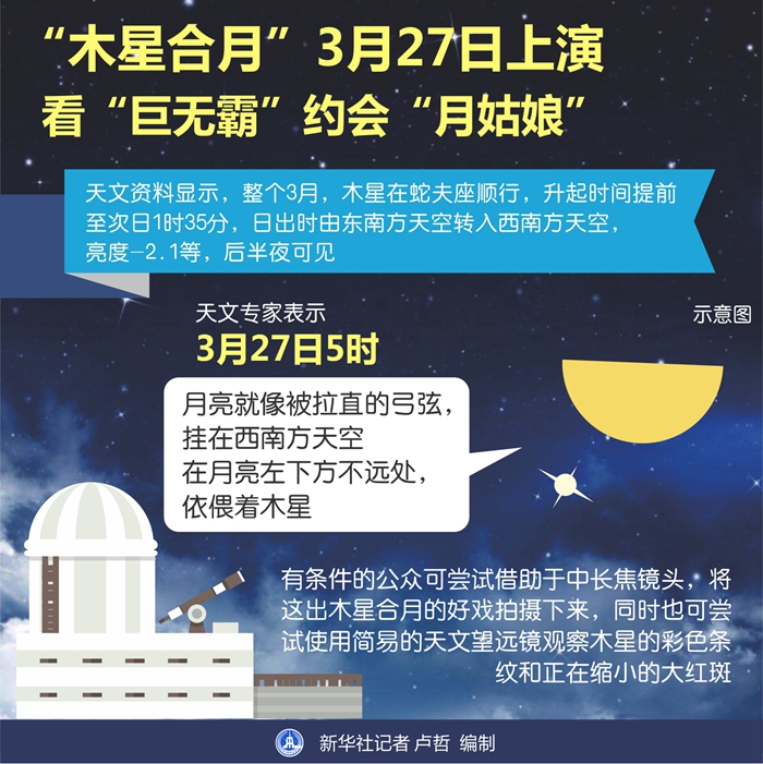 天文教育專家、天津市天文學會理事趙之珩介紹說,27日5時,月亮就像被拉直的弓弦,掛在西南方天空,晶瑩剔透,泛著乳白色的光芒。在月亮左下方不遠處,依偎著一顆明亮的星星,這就是木星。此時此刻,在黎明前的微微晨曦中,星月輝映,競放光芒,充滿詩情畫意。隨著天光增亮,木星逐漸被早霞淹沒,獨留月亮迎接日出的到來。