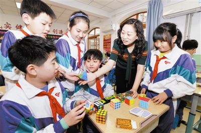 上圖 王曉卉指導(dǎo)學(xué)生玩魔方。記者 周偉 攝