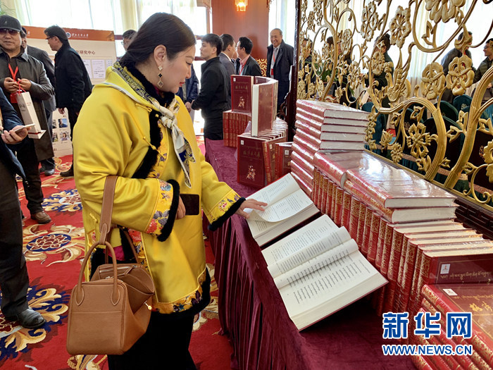 與會嘉賓在發(fā)布儀式現場翻閱《格薩爾文庫》。新華網 王頔 攝