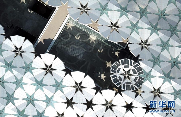 3月26日無人機拍攝的北京世園會園區(qū)“小行星”效果圖,位于畫面中心的建筑是中國館(電腦合成)。新華社記者 王建華 攝