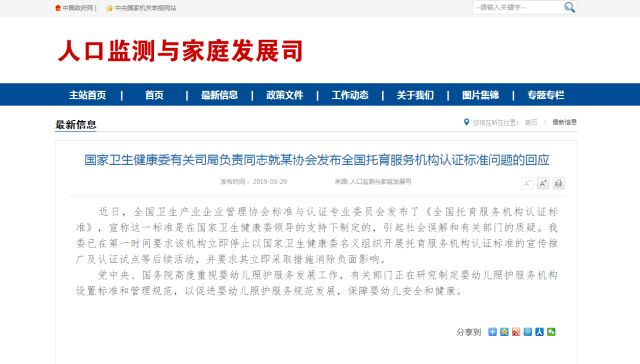 近日,全國衛(wèi)生產(chǎn)業(yè)企業(yè)管理協(xié)會(huì)標(biāo)準(zhǔn)與認(rèn)證專業(yè)委員會(huì)發(fā)布了《全國托育服務(wù)機(jī)構(gòu)認(rèn)證標(biāo)準(zhǔn)》,宣稱這一標(biāo)準(zhǔn)是在國家衛(wèi)生健康委領(lǐng)導(dǎo)的支持下制定的,引起社會(huì)誤解和有關(guān)部門的質(zhì)疑。我委已在第一時(shí)間要求該機(jī)構(gòu)立即停止以國家衛(wèi)生健康委名義組織開展托育服務(wù)機(jī)構(gòu)認(rèn)證標(biāo)準(zhǔn)的宣傳推廣及認(rèn)證試點(diǎn)等后續(xù)活動(dòng),并要求其立即采取措施消除負(fù)面影響。