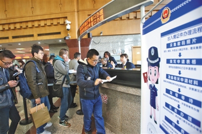 昨日,北京市公安局出入境接待大廳,居民排隊(duì)領(lǐng)號辦理出入境證件。記者 王貴彬 攝