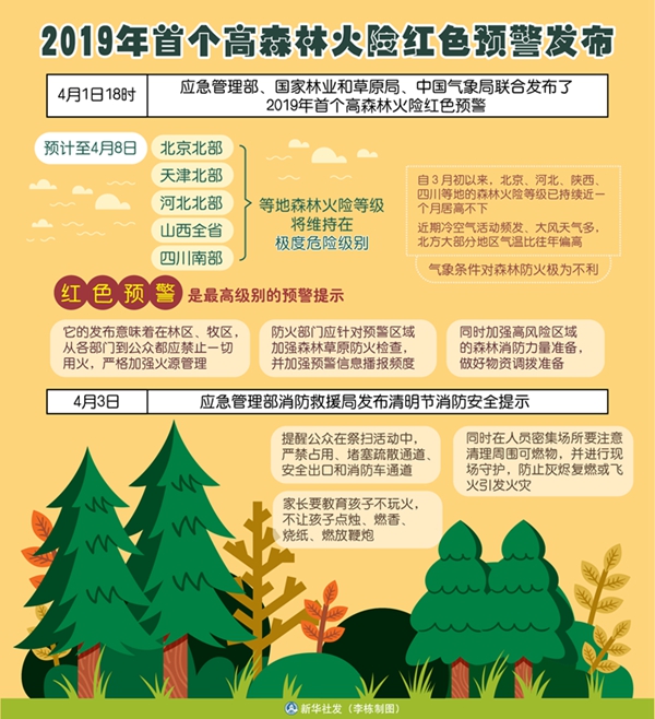 “此次紅色預(yù)警是三部門綜合考慮氣象條件、林區(qū)物候及衛(wèi)星林火監(jiān)測(cè)、清明節(jié)期間祭掃影響等情況,經(jīng)過會(huì)商研判共同發(fā)布的?!敝袊?guó)氣象局公共氣象服務(wù)中心副首席楊曉丹說,自3月初以來,北京、河北、陜西、四川等地的森林火險(xiǎn)等級(jí)一直居高不下,已持續(xù)近一個(gè)月;近期冷空氣活動(dòng)頻發(fā)、大風(fēng)天氣多,北方大部分地區(qū)氣溫比往年偏高,氣象條件對(duì)森林防火極為不利。