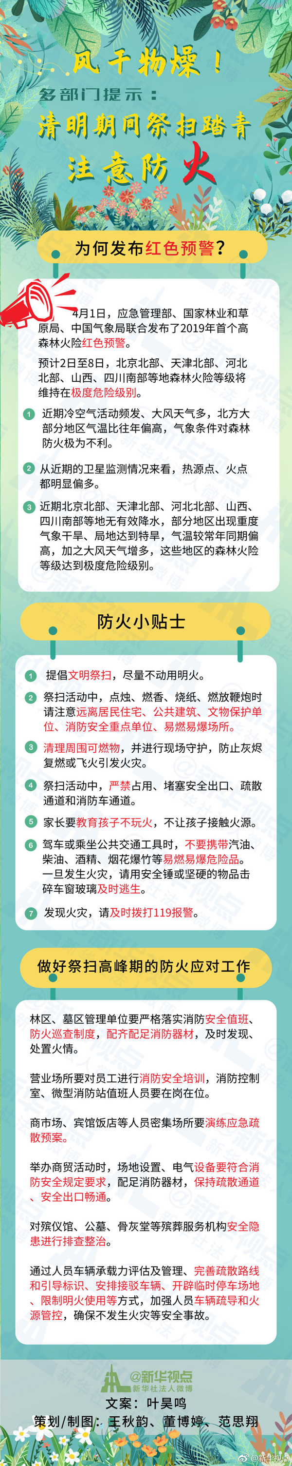 “此次紅色預(yù)警是三部門綜合考慮氣象條件、林區(qū)物候及衛(wèi)星林火監(jiān)測(cè)、清明節(jié)期間祭掃影響等情況,經(jīng)過(guò)會(huì)商研判共同發(fā)布的?!敝袊?guó)氣象局公共氣象服務(wù)中心副首席楊曉丹說(shuō),自3月初以來(lái),北京、河北、陜西、四川等地的森林火險(xiǎn)等級(jí)已持續(xù)近一個(gè)月居高不下,近期冷空氣活動(dòng)頻發(fā)、大風(fēng)天氣多,北方大部分地區(qū)氣溫比往年偏高,氣象條件對(duì)森林防火極為不利。