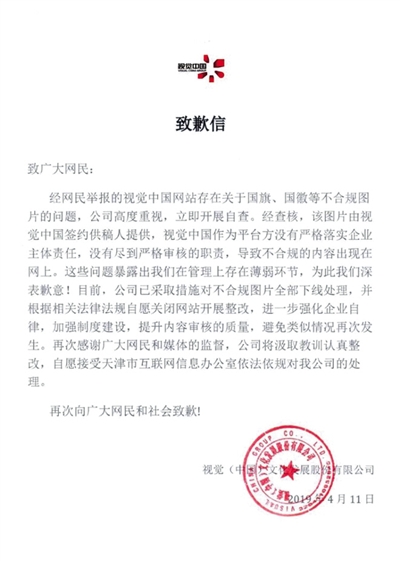 視覺(jué)中國(guó)致歉信。